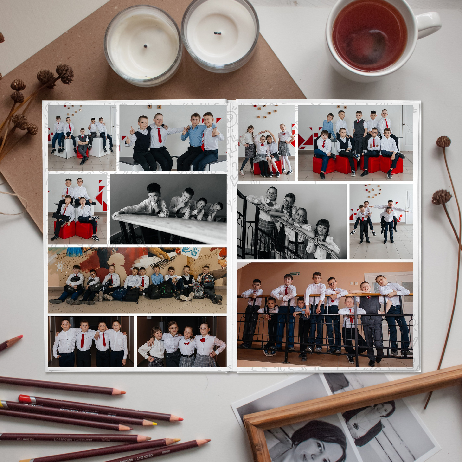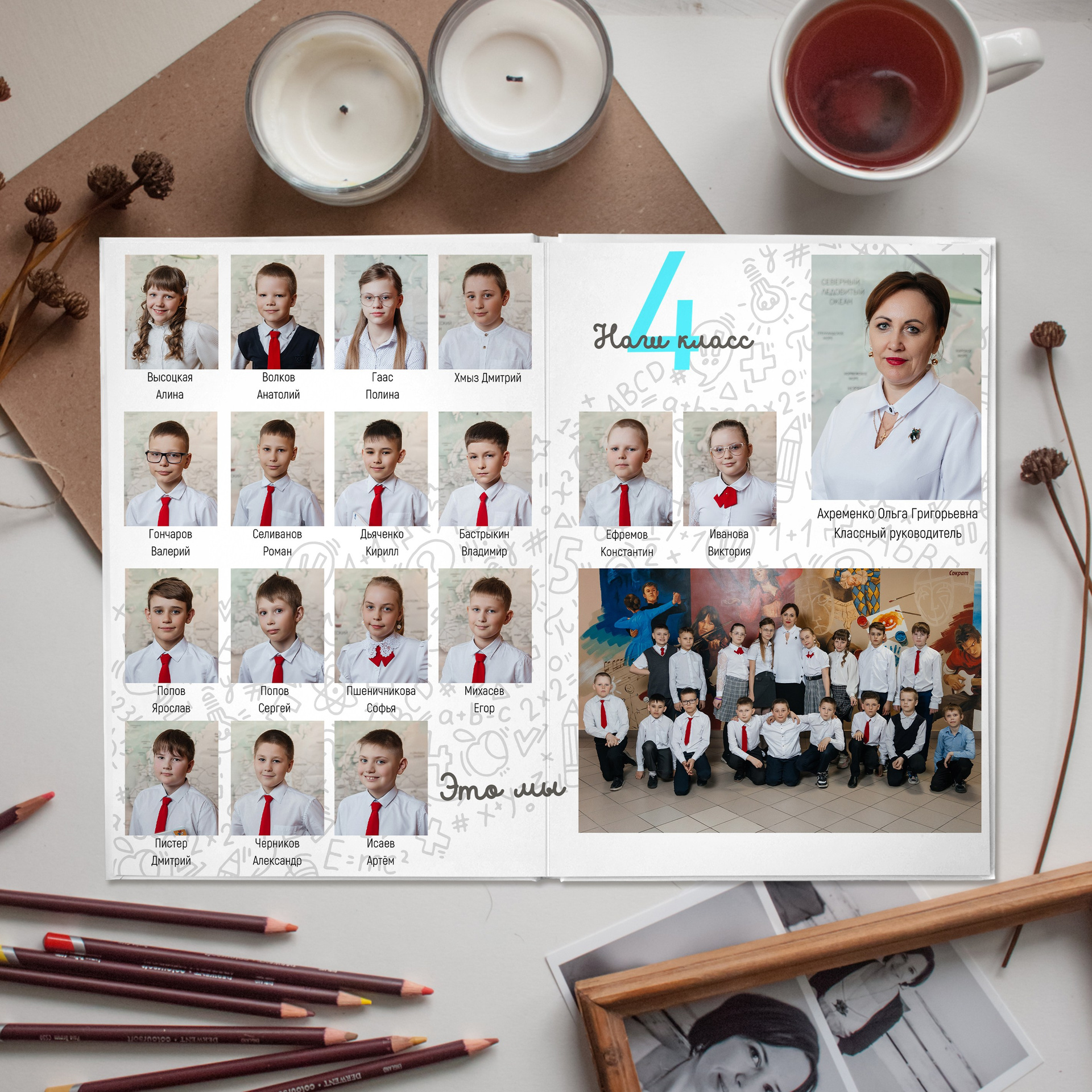 📍 2 разворот — 3 фотографии в мини-группах + 1 фото с учителем в группе или общий разворот из 9 фото или учителя — предметники + общее фото.