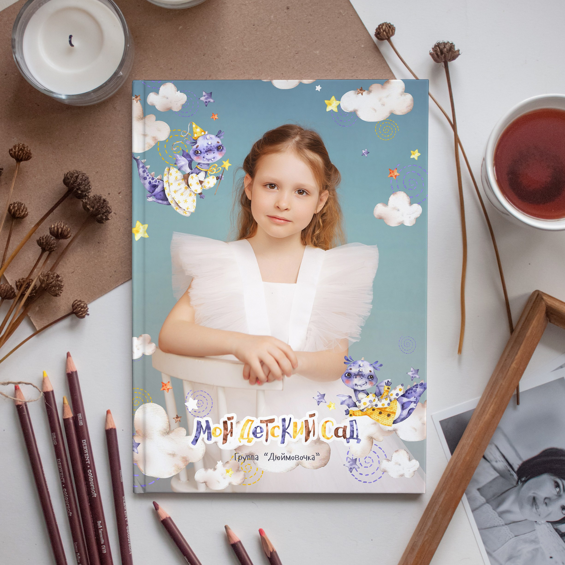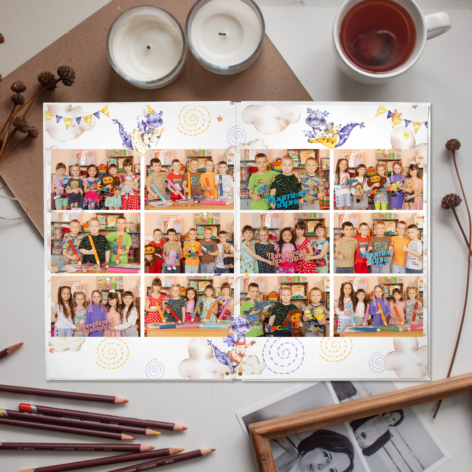 Фотокнига на 2 разворота, в твёрдом переплете с твёрдыми листами с ламинацией для выпускников школ и детских садов. Разворот 180’. Формат книги а4, книжная ориентация. От 2 разворотов.