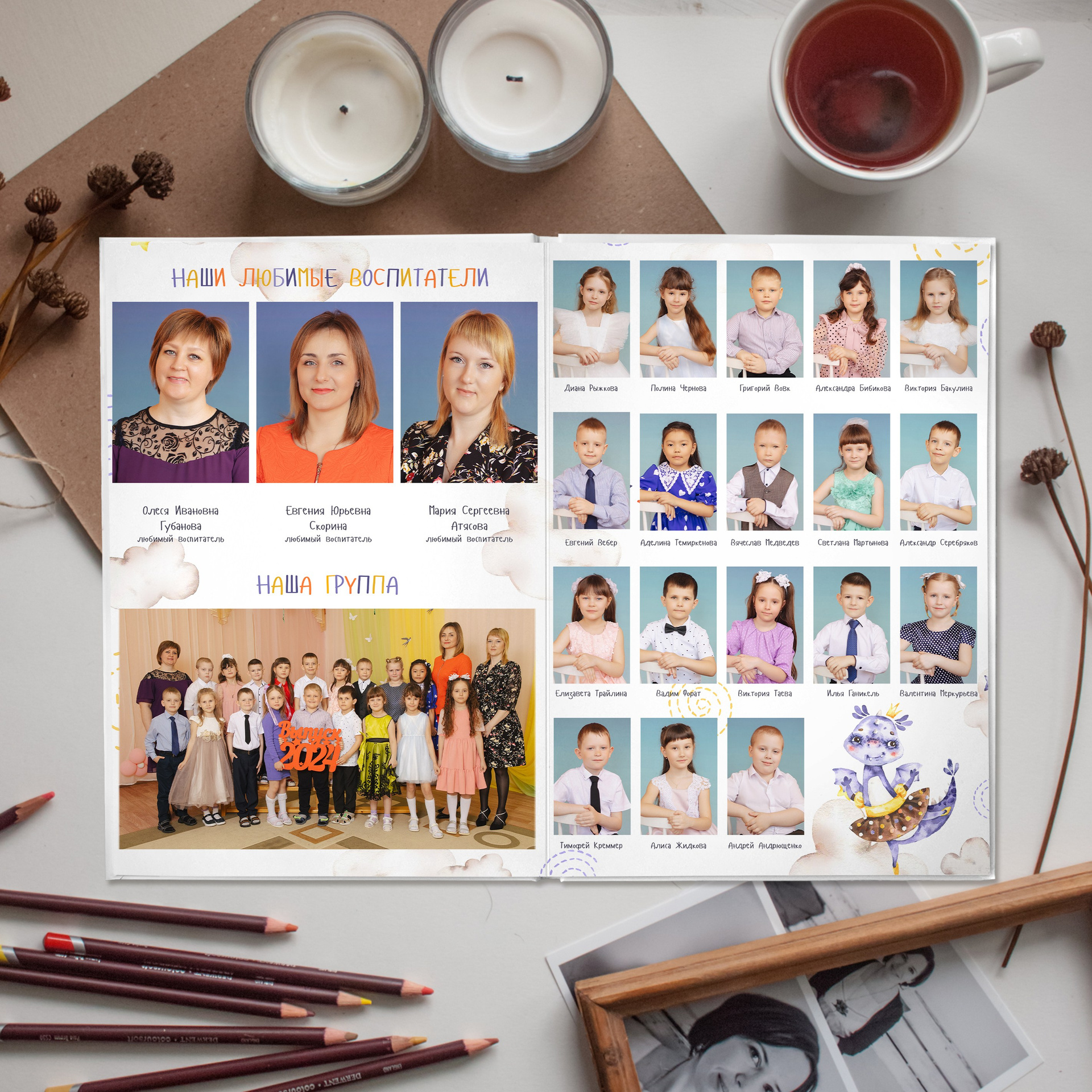 📍 2 разворот — 3 фотографии в мини-группах + 1 фото с учителем в группе или общий разворот из 9 фото или учителя — предметники + общее фото.